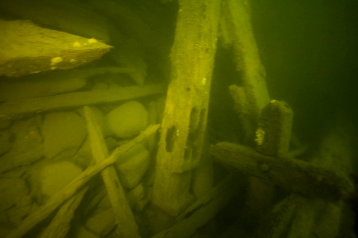Knekten står nedfallen upp och ned i vraket. Nederst syns ett urtag där betingbalken suttit. Det har alltså funnits två likadana knektar med en betingbalk mellan. En pollare/huvud kan skymtas längst ned. Timret till höger i form av ett kors är sannolikt recent.
