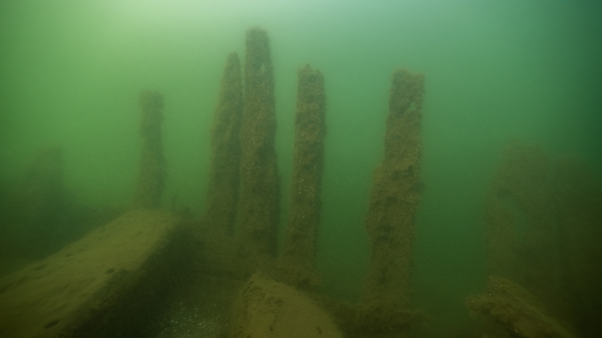 Spanten sticker upp cirka 1,5 meter och skvallrar om skeppets form. Notera däcksbalken till vänster samt innergarneringen bakom den. Fartygslämning L1978:4814 Fredrik Wilhelm.