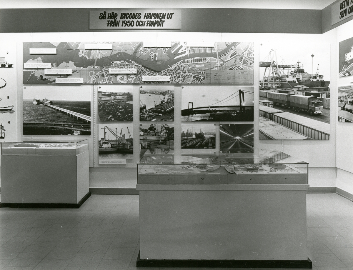 Utställningen "Från amfora till container". Utställningsinteriör som illustrerar Göteborgs hamns tillväxt från 1950 och framåt.