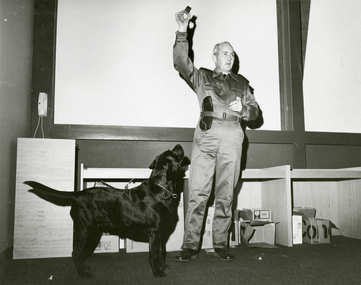 Utställningen "Något att förtulla?". Vernissagetillfället där en narkotikahunds färdigheter visas upp.