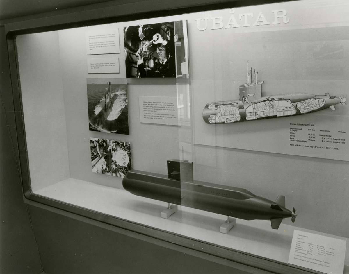 Den permanenta utställningen fotograferad 1987. Monter som handlar om ubåtar. I montern syns fartygsmodell av ubåten NÄCKEN.