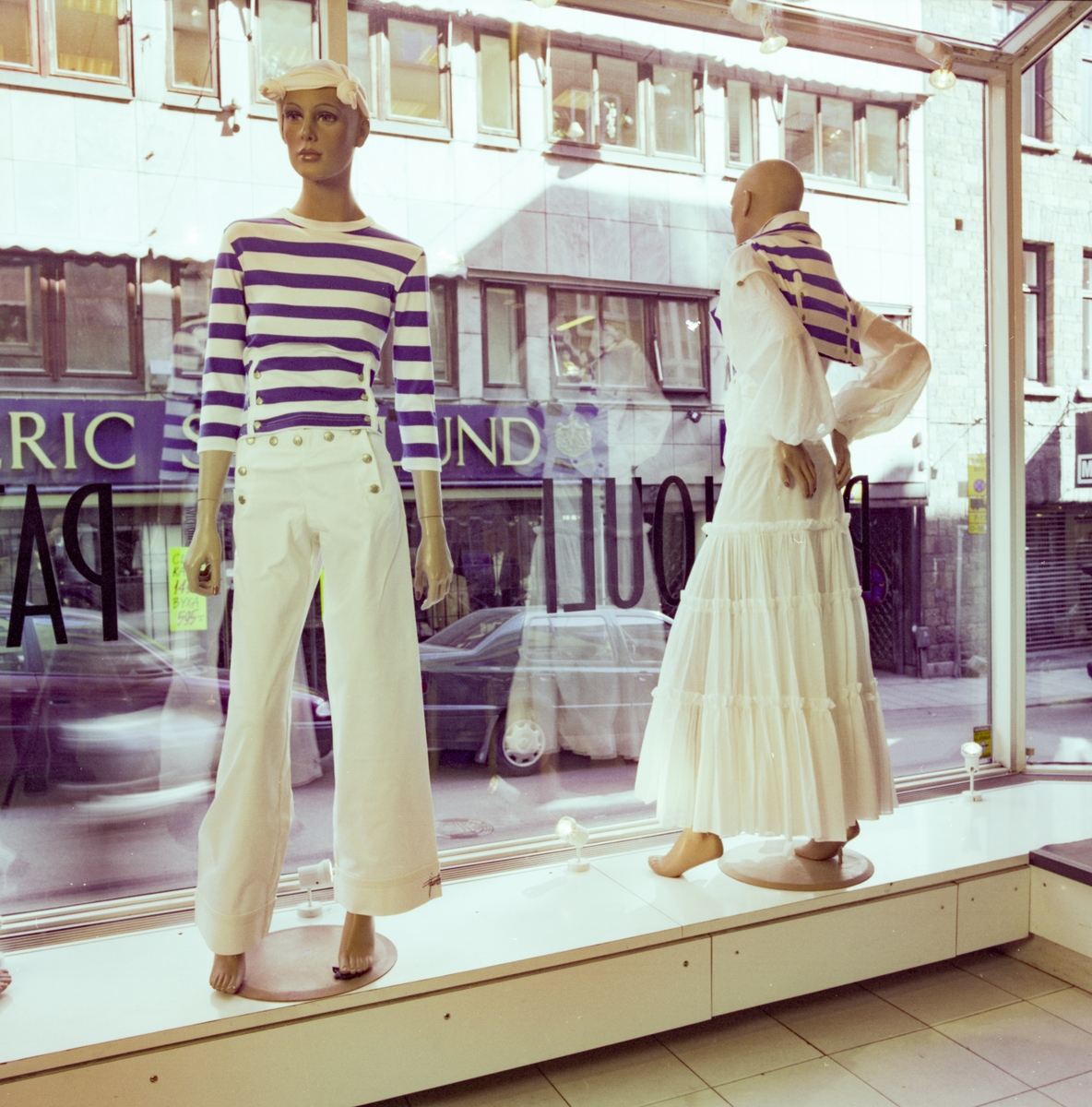 I samband med utställningen "Sjömanskostymen". Jean-Paul Gaultier-kläder i ett skyltfönster.
