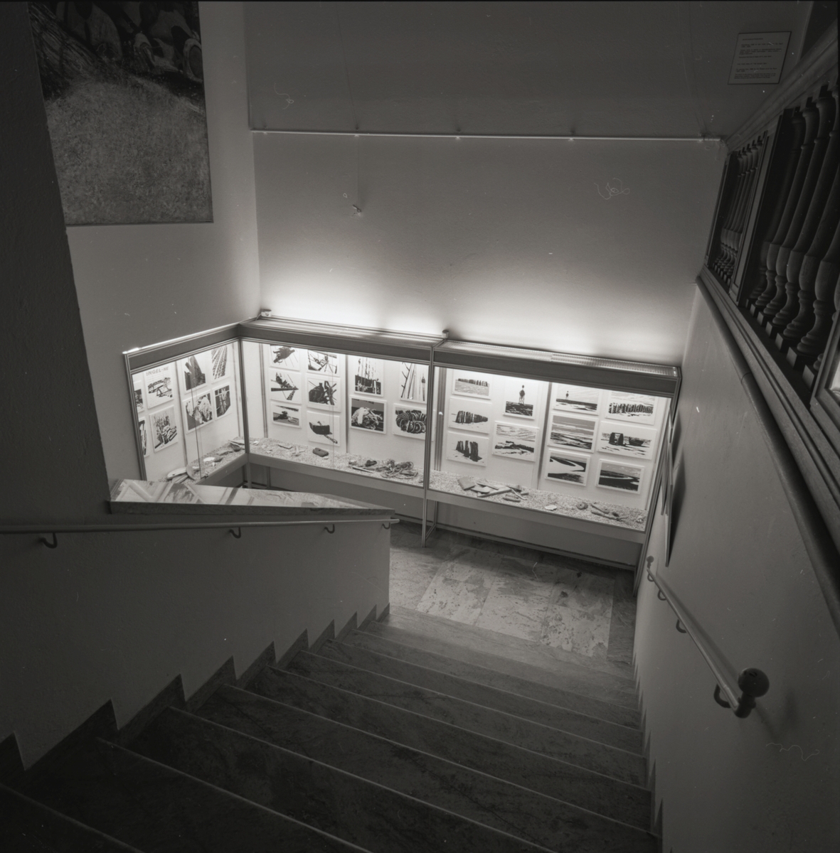 Utställningen "Grafiska bilder från kusten". Överblicksbild av utställningen i trappmonter. Grafiska blad av konstnären Helmuth B Rupprecht.