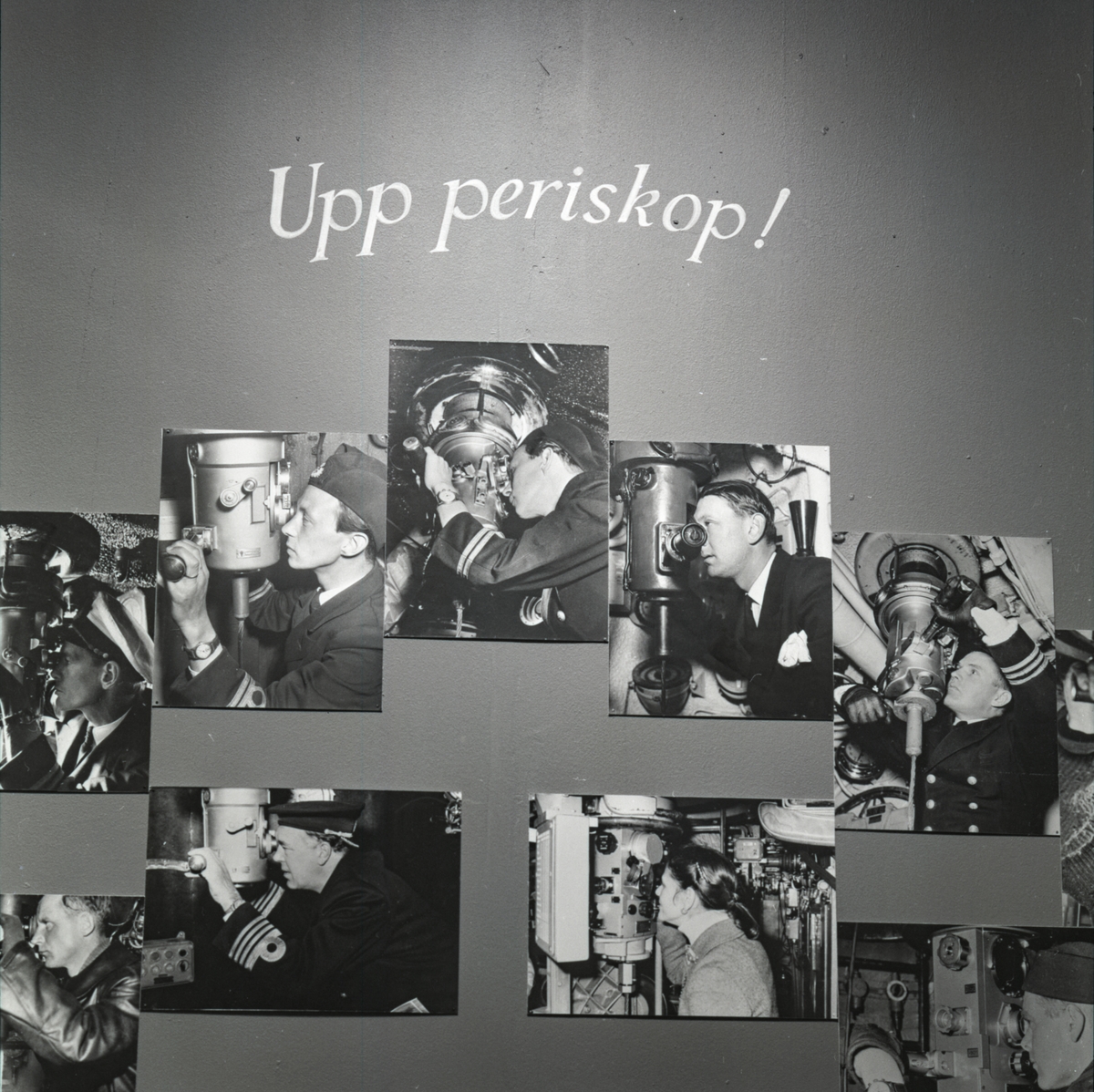 Utställningen "Upp periskop". Vägg med fotografier av personer som tittar i ett periskop. Troligen inledningen av utställningen.
