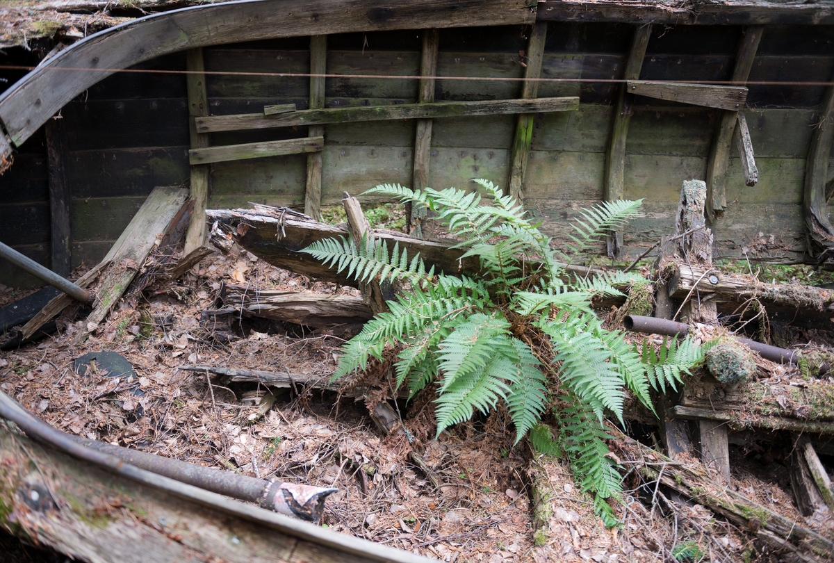 Förfallet vrak av baltisk flyktbåt i skogen på Järflotta. År 1943 användes båten av en grupp på fem för att fly från det Nargö och det ockuperade Estland till Sverige.