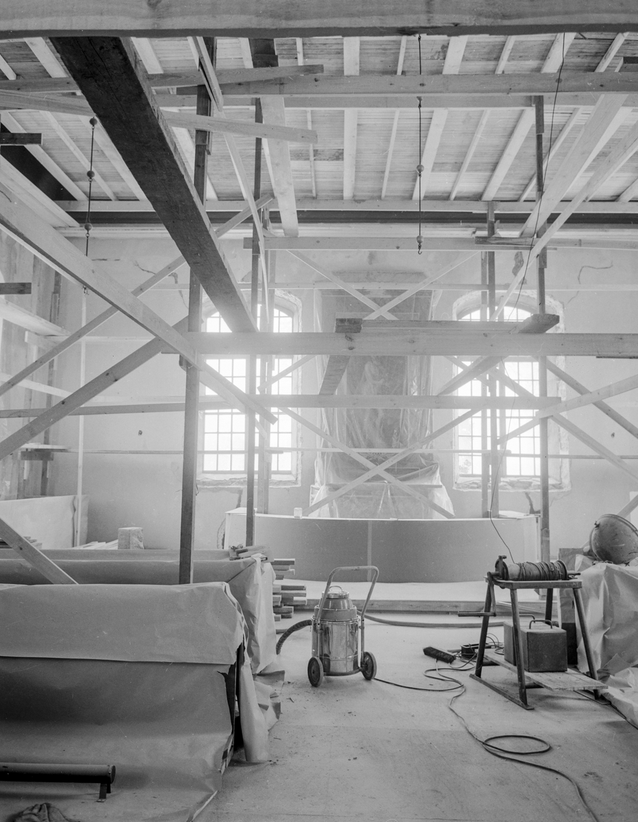 Vårvintern 1972 var den inre restaureringen av Bankekinds kyrka i full gång. Hela kyrkorummet målades om i en ljusare färgsättning anpassad till kyrkans fasta färginslag av antikvariskt intresse. Här en blick mot kyrkans kor där de tidigare igensatta fönstren tillfälligt tagits fram för att åter igenslutas med en grund nisch. Kyrkan återinvigdes den 3 september i närvaro av biskop Ragnar Askmark.