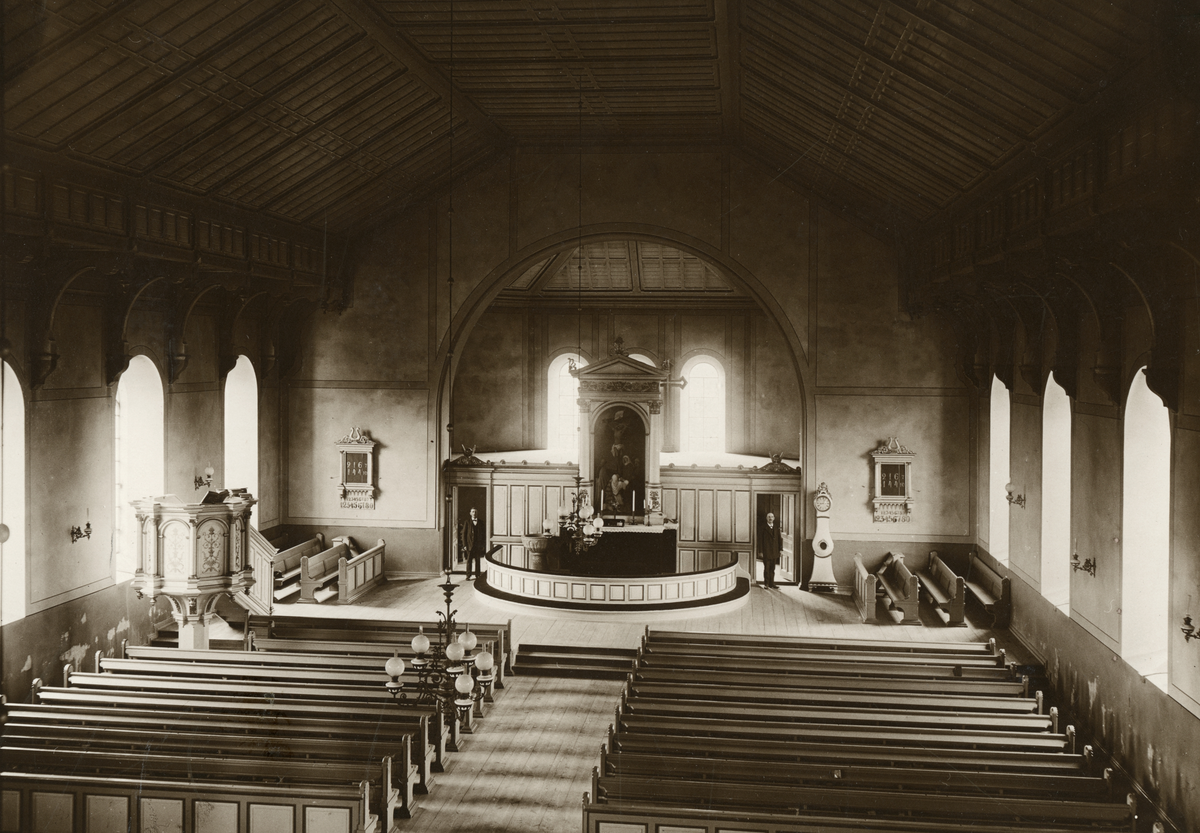 Odaterad interiör från Hannäs kyrka före 1923 års restaurering. Dokumentation av snickaren och bygdefotografen Axel Lundgren.