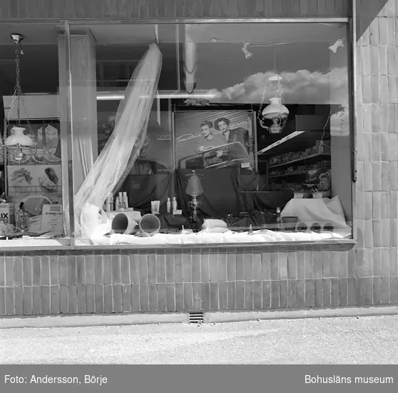 "Skyltfönster längst mot söder. I skyltfönstret visas lampor, kosmetika, bijouterier m m. Skylten är gjord av Ingela Antonsson"