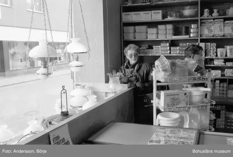 "Kunden Henny Nilsson från Ljungskile vid skyltfönstret vid norra gaveln. Henny brukar handla mycket här. "En trevlig affär för allt möjligt". På bilden syns också Nils Antonsson"