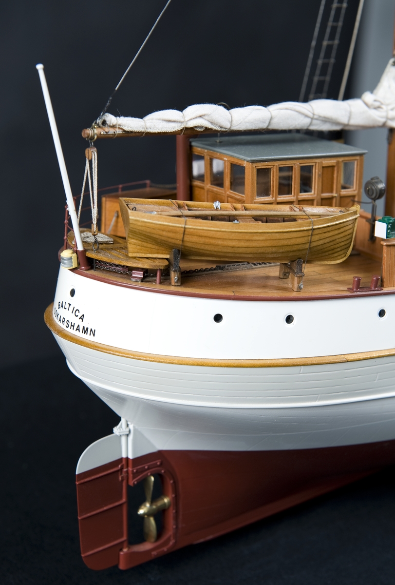Detaljbild av modell av tremastskonaren BALTICA, byggd i Sjöhistoriska museets modellverkstad av Stefan Bruhn och Jan Claesson
