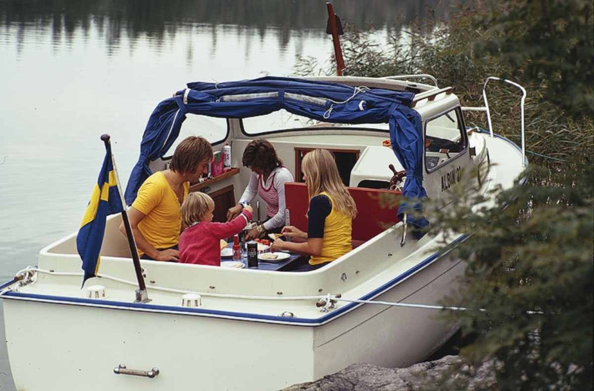 Albin 21 förtöjd i en vik. Marknadsföringsbild.