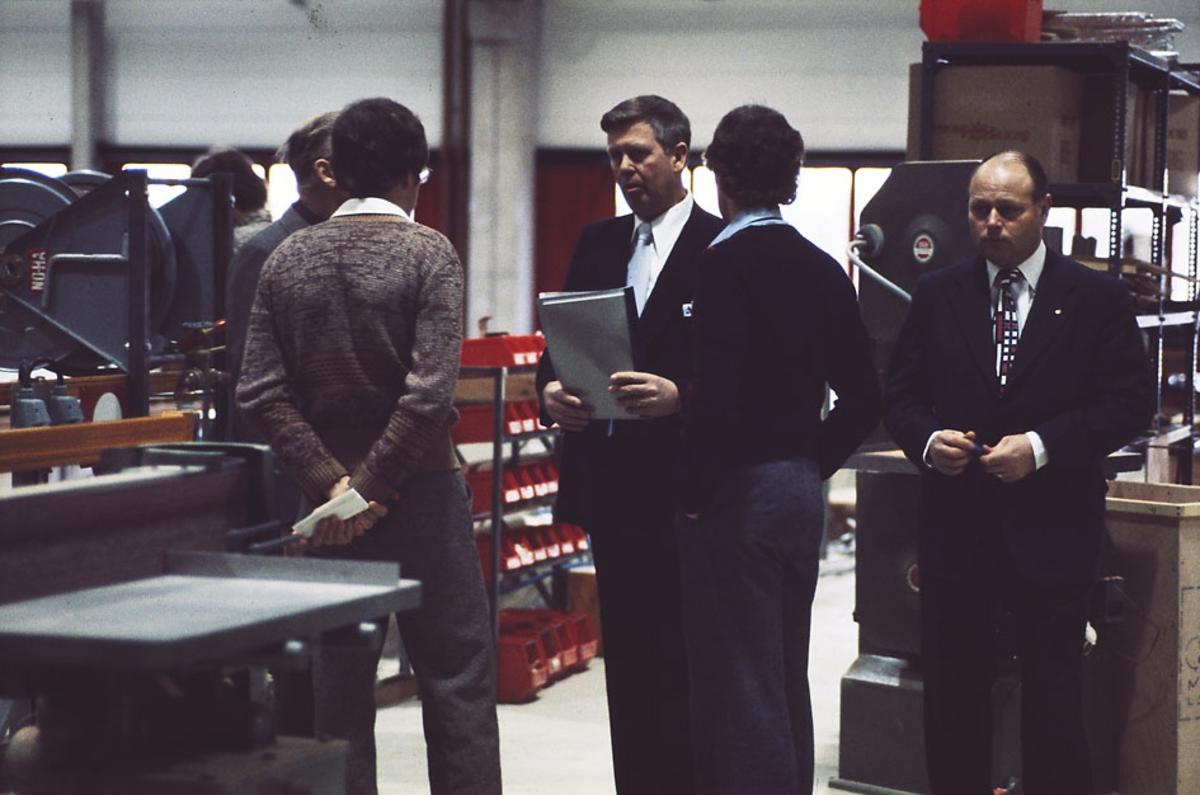 Interiör från Albin Marins anläggning i Kristinehamn (Gustavsvik). VD Uno Eriksson visar runt besökare vid invigningen 23 januari 1975.