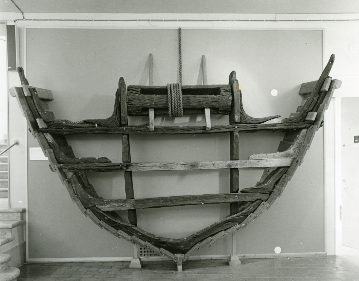 Sjöhistoriska museets permanenta utställning fotograferad 1987. Tvärsektion av KALMARFYND, spant, balkar, balkknä och vindspel.