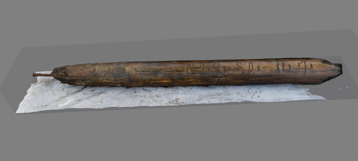 3D modell av en av pålarna som framkom i grop nummer 7. Modell: Jim Hansson