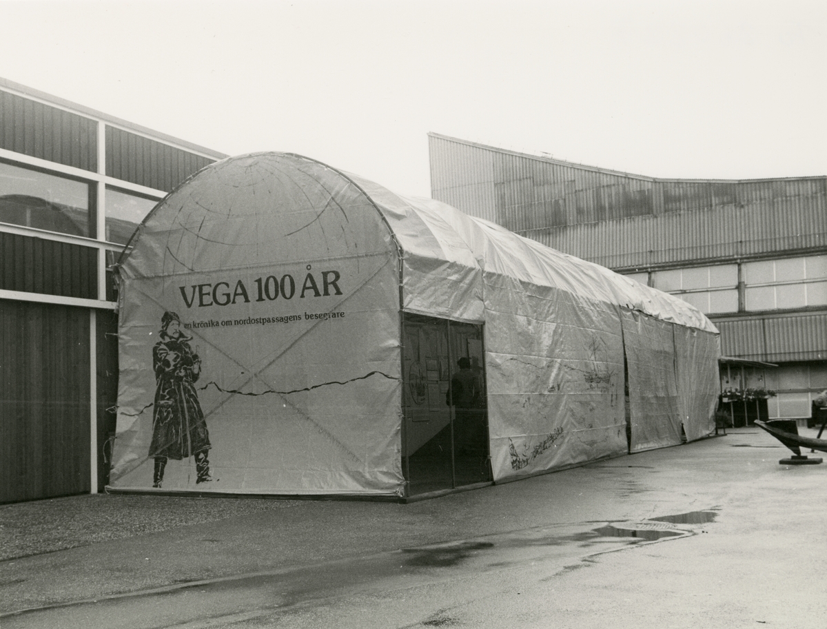 Utställningen "Vega 100 år en krönika om nordostpassagens besegrare". Tillfällig utställning i tält på Djurgården i Stockholm. Utställningstältet sett utifrån.
