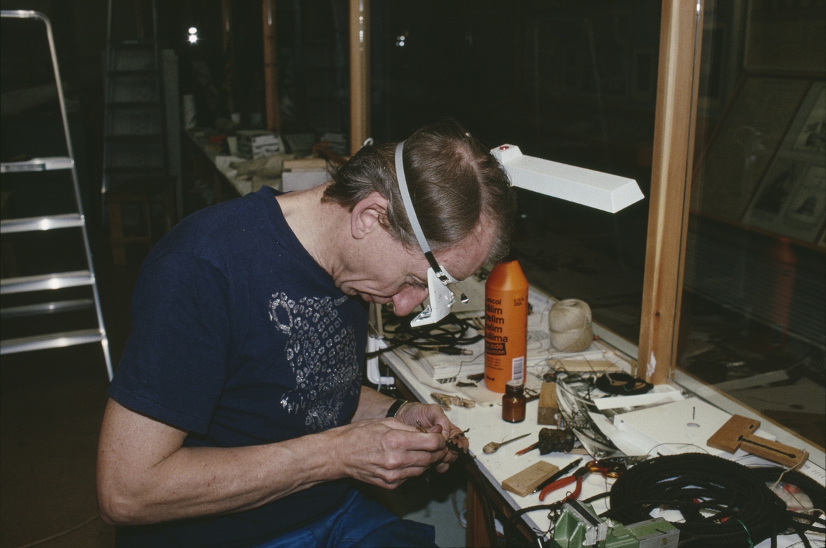 Modellkonservator Göran Forss arbetar med modellen av Vasa i den specialinredda modellverkstaden invid Sjöhistoriska museets entré.