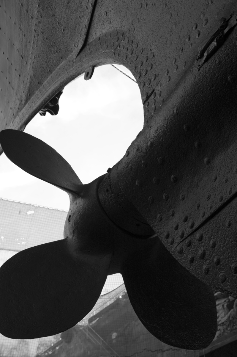 Isbrytaren Sankt Erik vid dockan på Beckholmen för underhållsarbete, november 2005. Närbild på propeller.