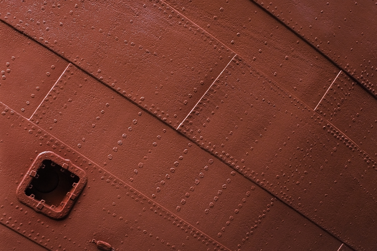 Närbild på isbrytaren Sankt Eriks nitade skrov.