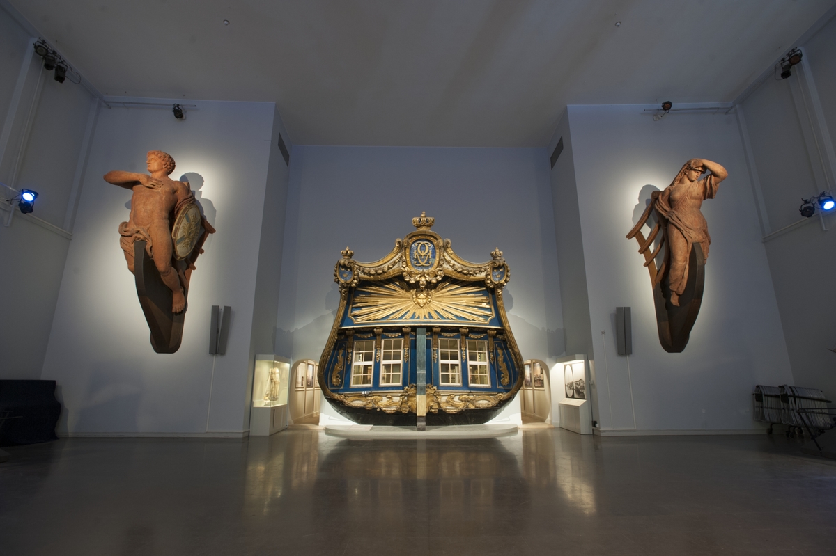 Minneshallen på Sjöhistoriska museet. Akterspegeln från den kungliga skonerten Amphion flankerad av galjonsbilderna från linjeskeppen Dygden och Vladislaff (t.v.) och fregatten Eurydice (t.h.).
