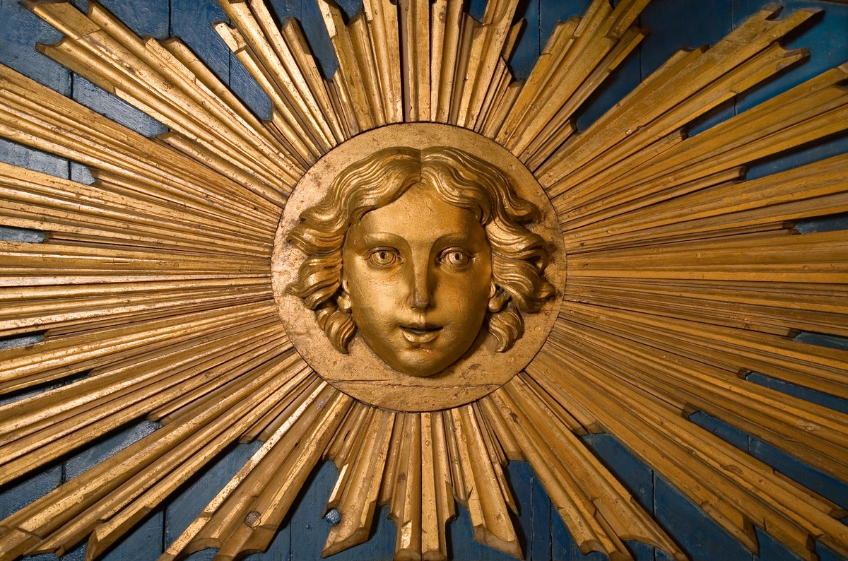 Titel: Skupturdetalj från Amphions akterspegel. Förgyllt manshuvud omgivet av solstrålar.