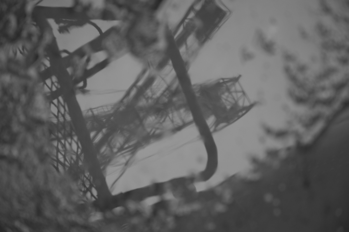 Reflektion av kran i vattenpöl på botten av Gustav V:s torrdocka, Beckholmen, Stockholm.