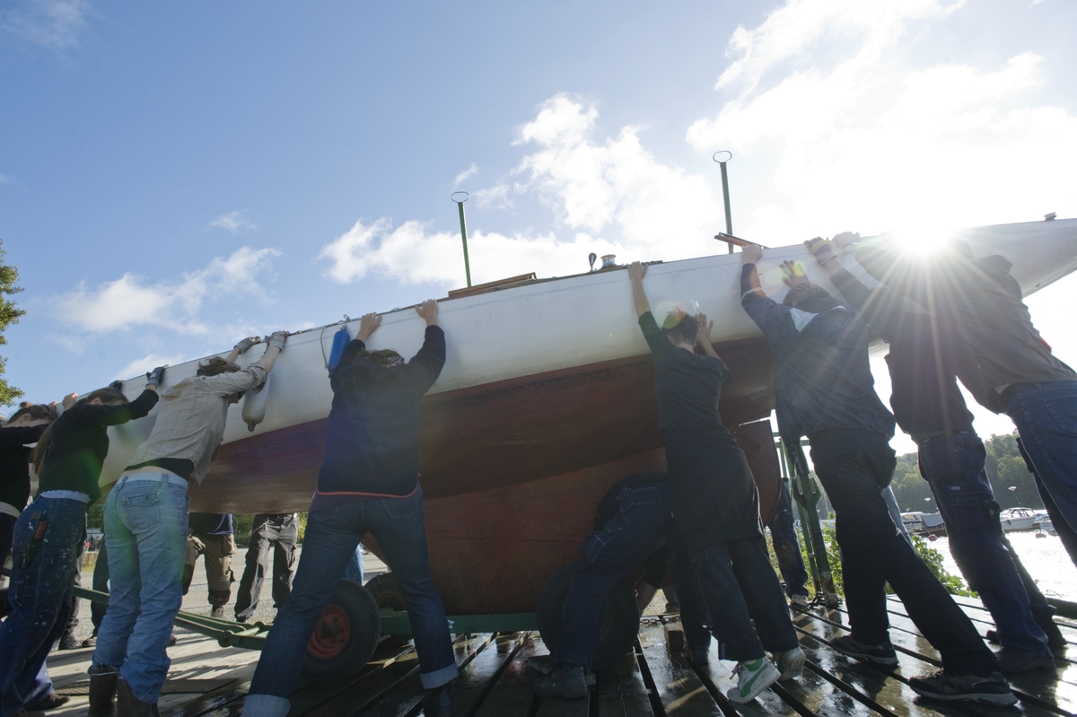 Titel: Båtupptagning på gammalt traditionellt vis, med handkraft, på Årstavikens SS vid Eriksdalsbadet 26 september 2009