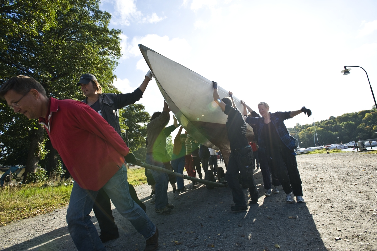 Titel: Båtupptagning på gammalt traditionellt vis, med handkraft, på Årstavikens SS vid Eriksdalsbadet 26 september 2009