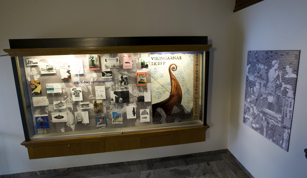 Utställning i trappmonter på Sjöhistoriska museet. Vernissagekort genom tiderna visas.