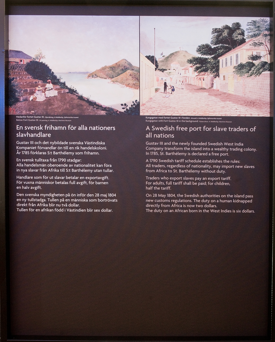 Vandringsutställningen "En dunkel historia" om den transatlantiska slavhandeln. Skylt med utställningstext.