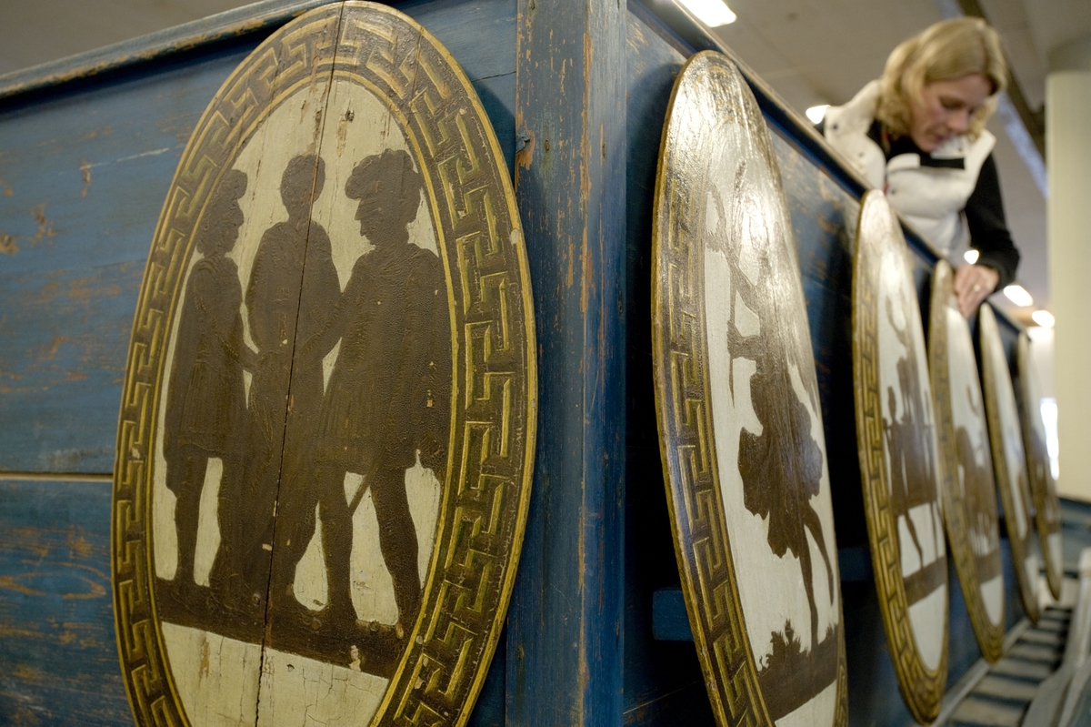 Titel: Sköldar med antika motiv på sidorna av den kungliga slupen DELFINEN.