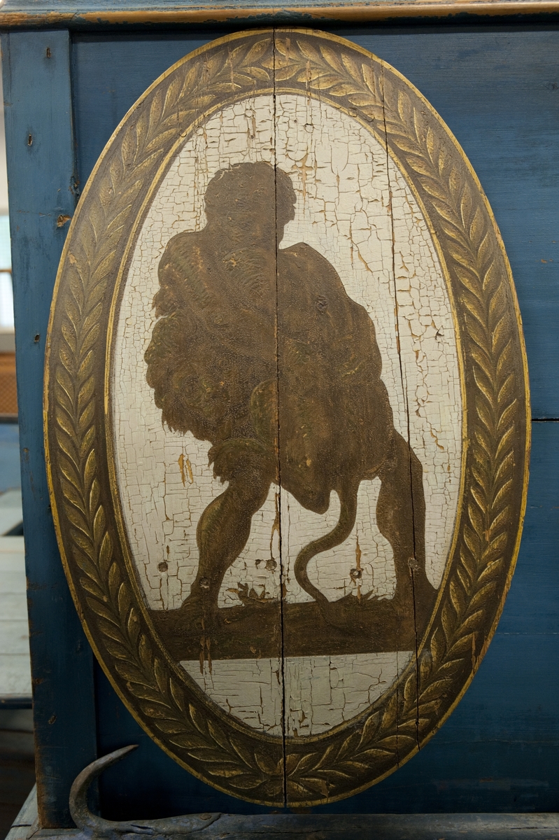 Sköld med antikt motiv på sidan av den kungliga slupen DELFINEN.
