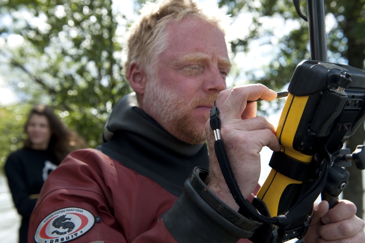Statens maritima marinarkeologer på Birka för undersökning av ev bryggkonstruktion i vattnet.
