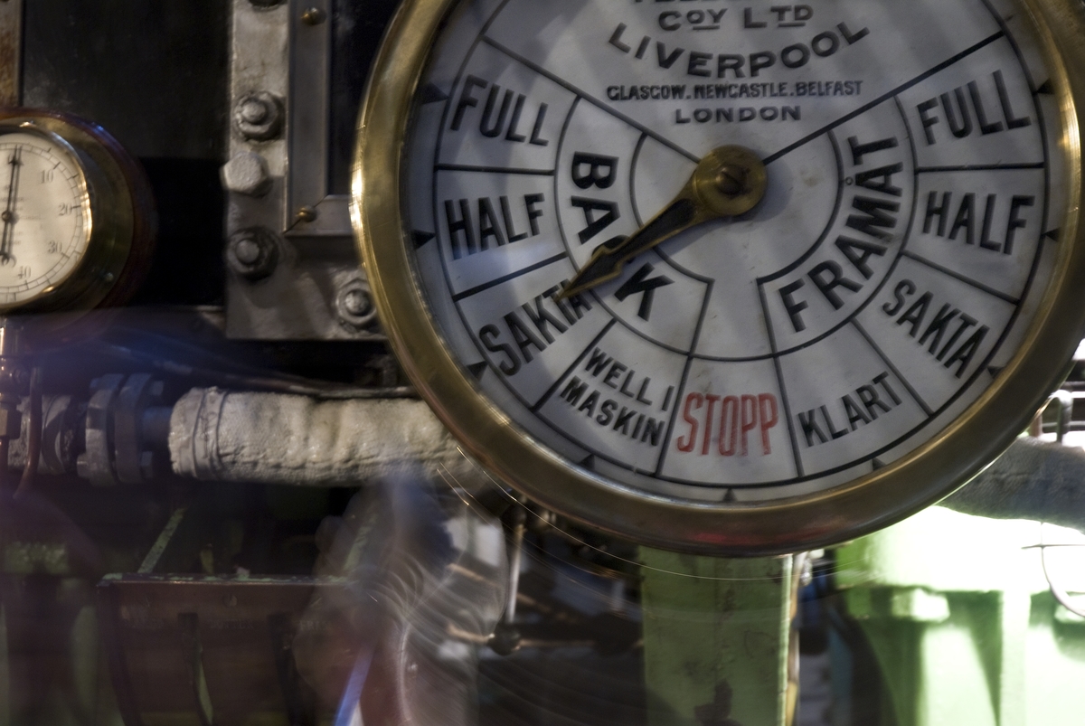 Maskintelegraf nere i isbrytaren Sankt Eriks maskinrum.