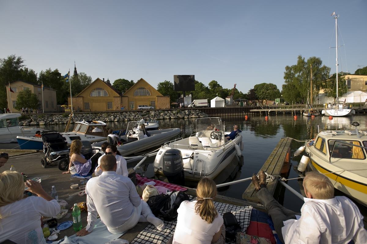 Titel: Tre seklers flaggskepp, maj 2008. Båt in bio i Wasahamnen, visar "Pirates of the Carribean"