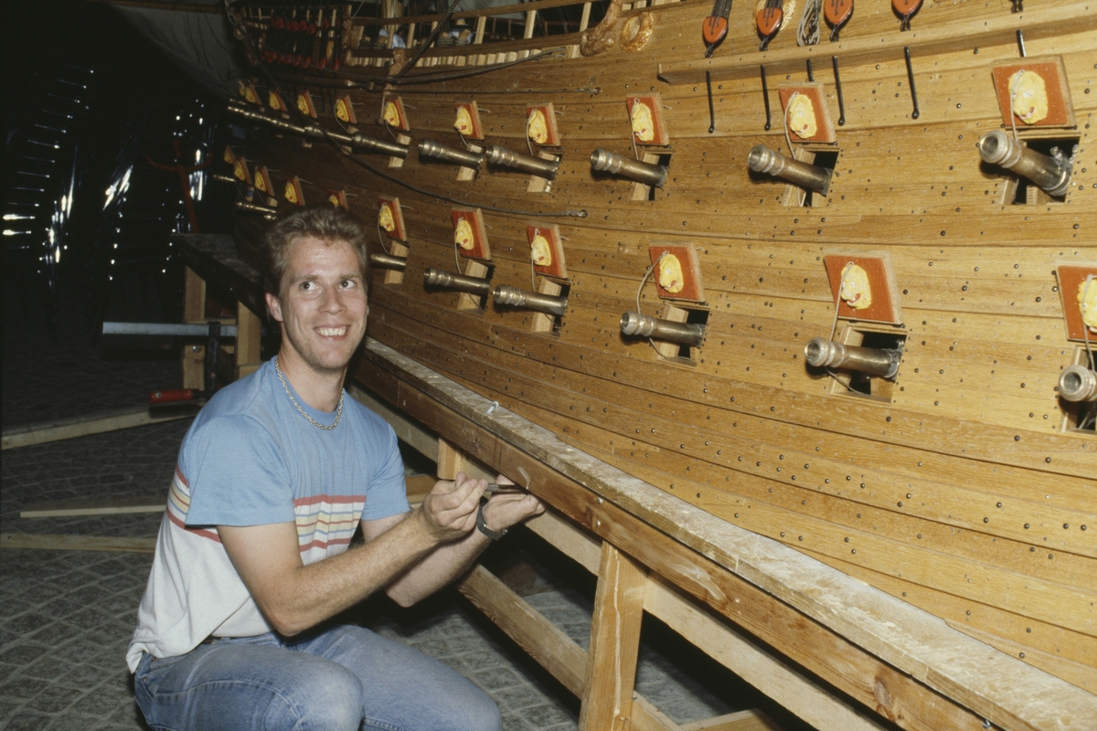 Modellbyggare Stefan Bruhn bredvid modellen av Vasa i skala 1:10.
