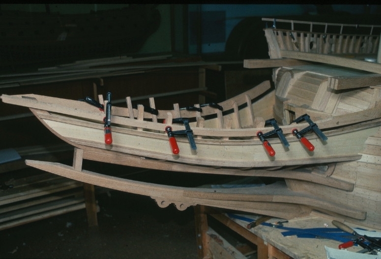Vasamodellen i skala 1:10 under byggnad. Stäv, galjon.