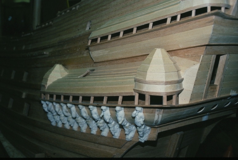 Vasamodellen i skala 1:10 under byggnad. Akterkastell, låringsgallerier.