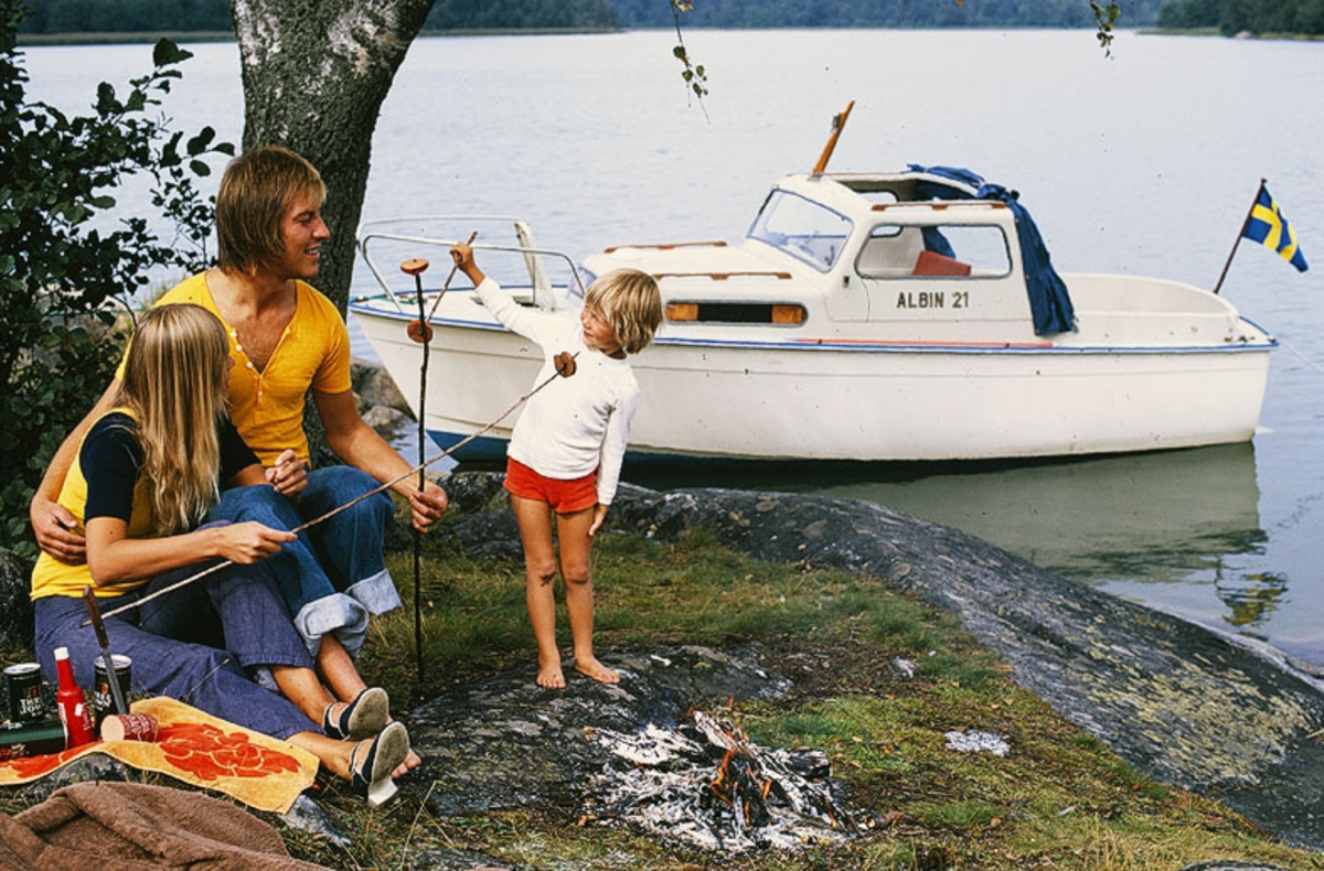 Titel: Albin 21 förtöjd i en vik. Marknadsföringsbild.