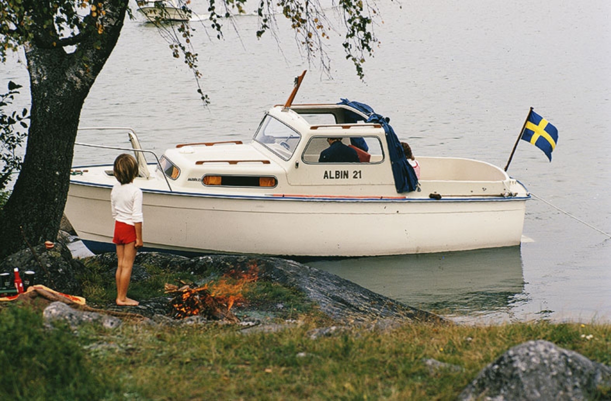 Titel: Albin 21 förtöjd i en vik. Marknadsföringsbild.