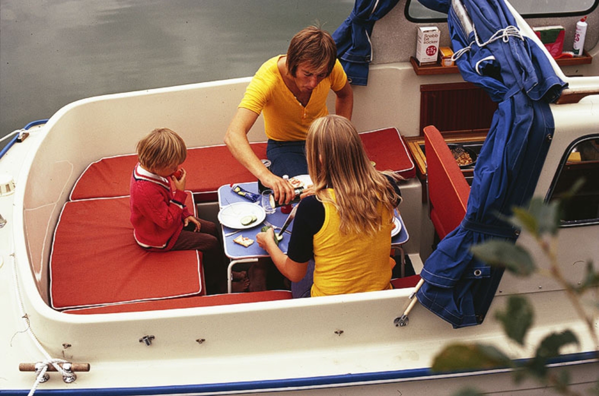 Albin 21 förtöjd i en vik. Marknadsföringsbild.