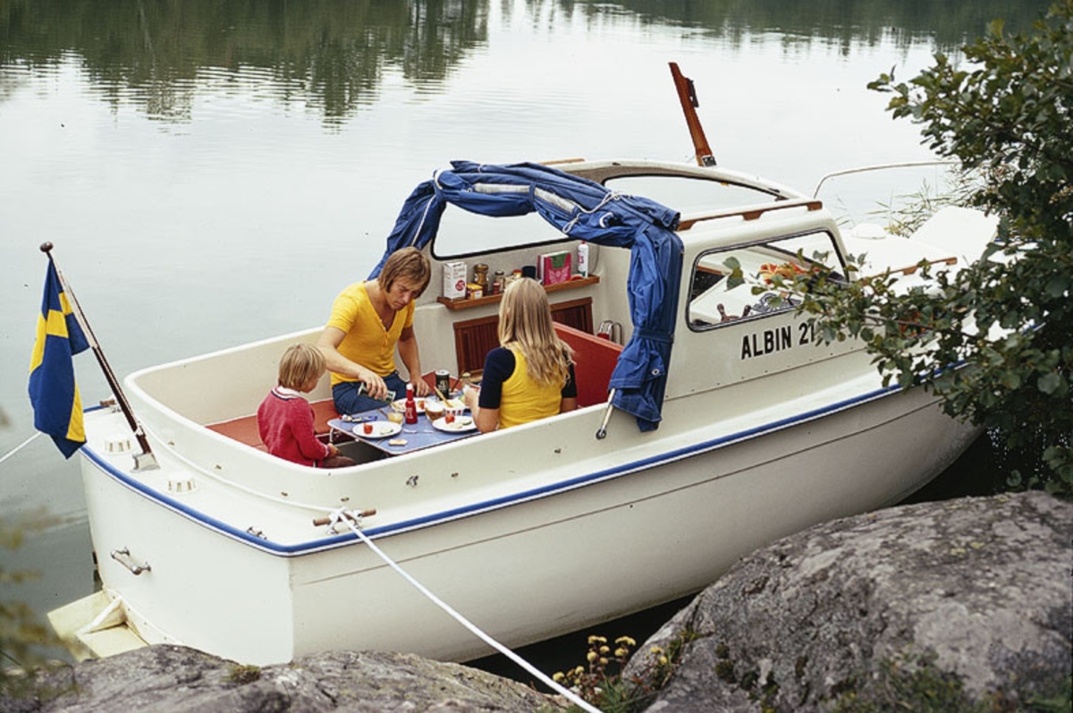 Albin 21 förtöjd i en vik. Marknadsföringsbild.