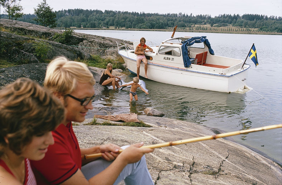 Albin 21 förtöjd i en vik. I förgrunden ett par med metspö. Marknadsföringsbild.