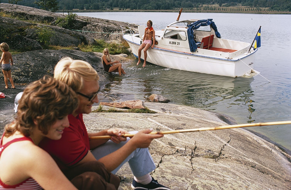 Albin 21 förtöjd i en vik. I förgrunden ett par med metspö. Marknadsföringsbild.