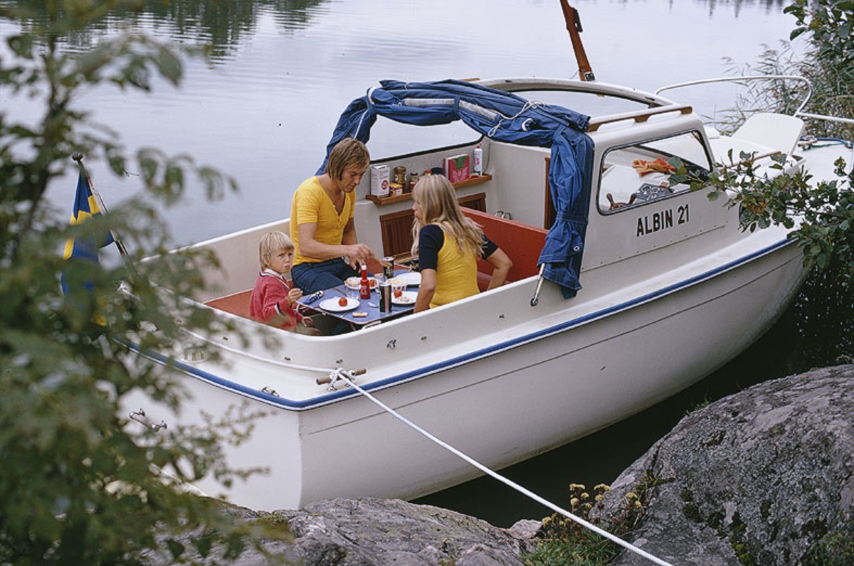 Titel: Albin 21 förtöjd i en vik. Marknadsföringsbild.