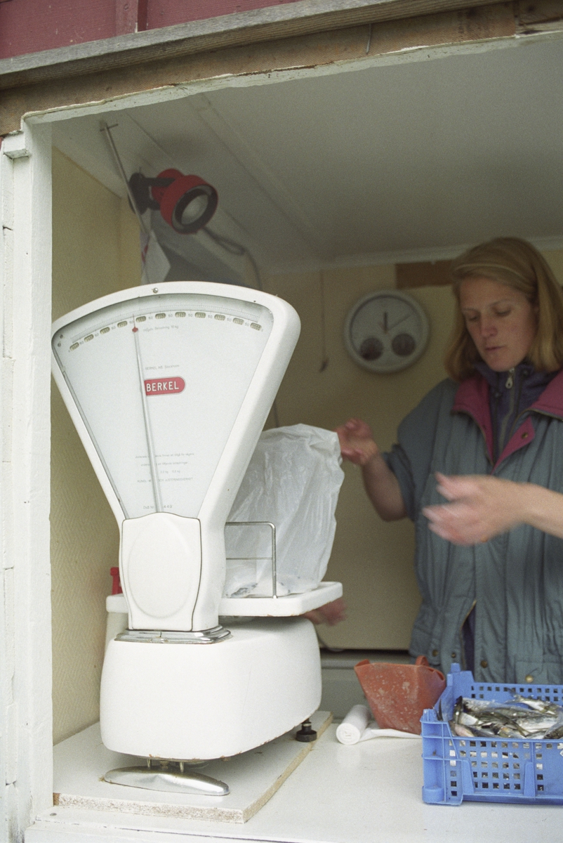 Titel: Skärgårdsprojektet 2003-2004 Fotodatum 17-21 juni 2003 Ingmarsö, Fiskboden, Anna Sieverts är säljare