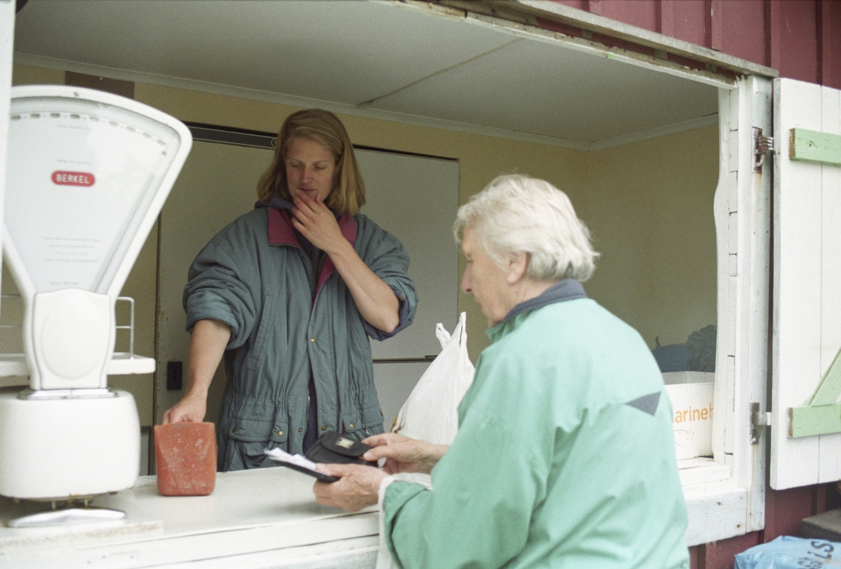 Titel: Skärgårdsprojektet 2003-2004 Fotodatum 17-21 juni 2003 Ingmarsö, Fiskboden, Anna Sieverts är säljare