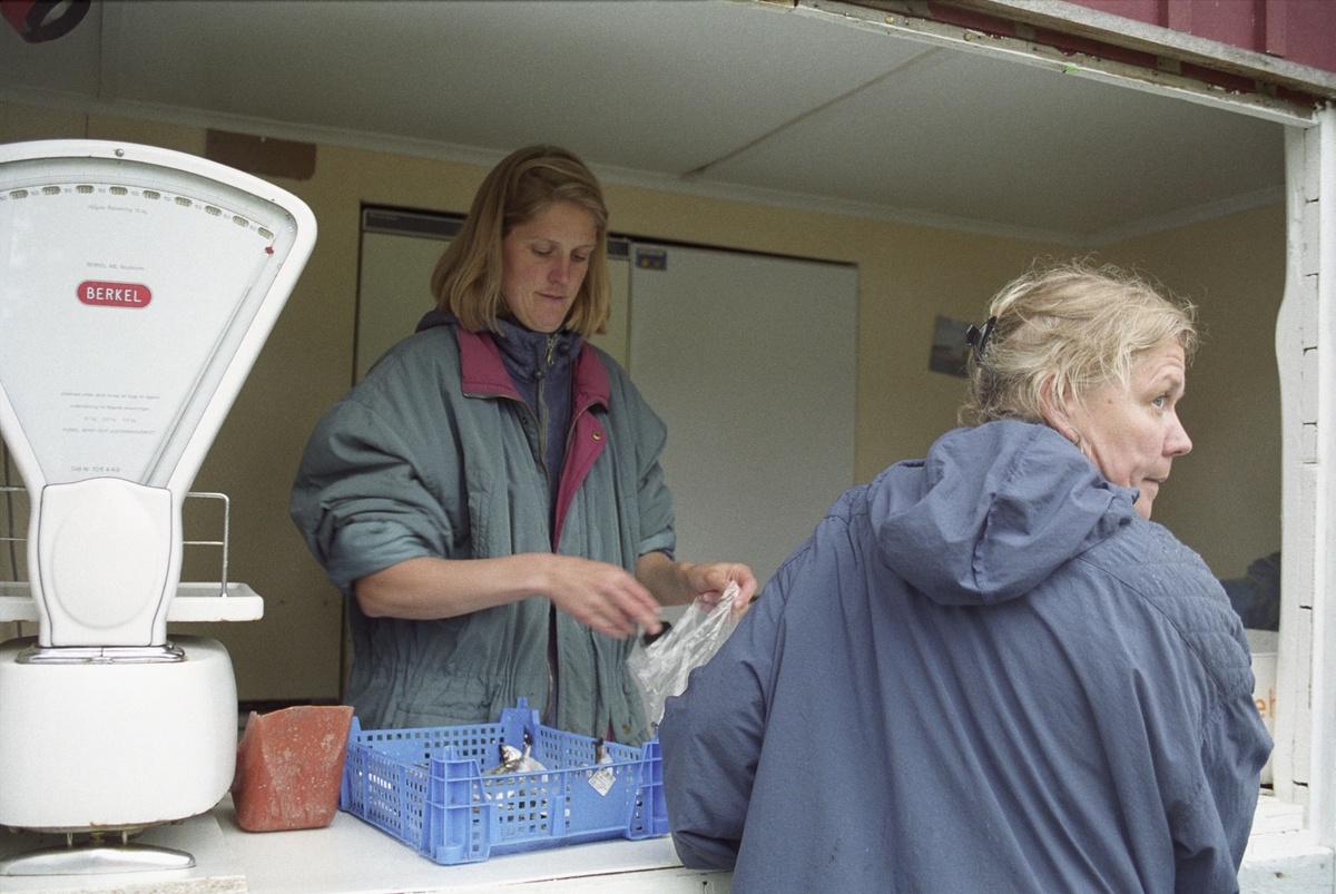 Titel: Skärgårdsprojektet 2003-2004 Fotodatum 17-21 juni 2003 Ingmarsö, Fiskboden, Anna Sieverts är säljare