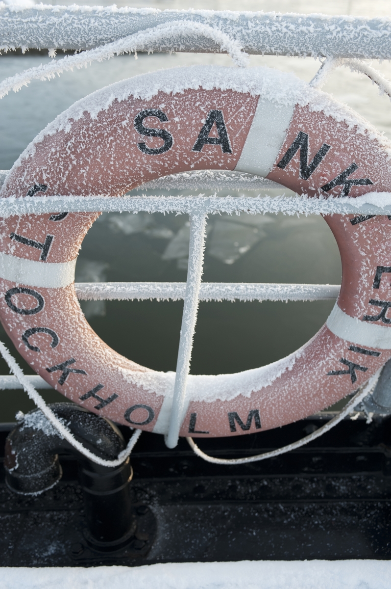 Livboj på isbrytaren Sankt Erik täckt av rimfrost.