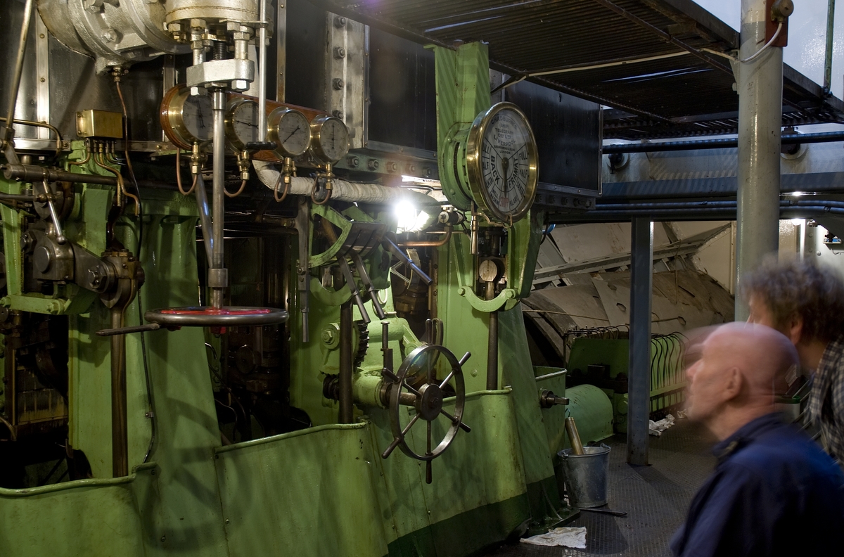 Del av isbrytaren Sankt Eriks aktre maskin. I bild maskinchief, maskintelegraf och panel med tryckmätare.