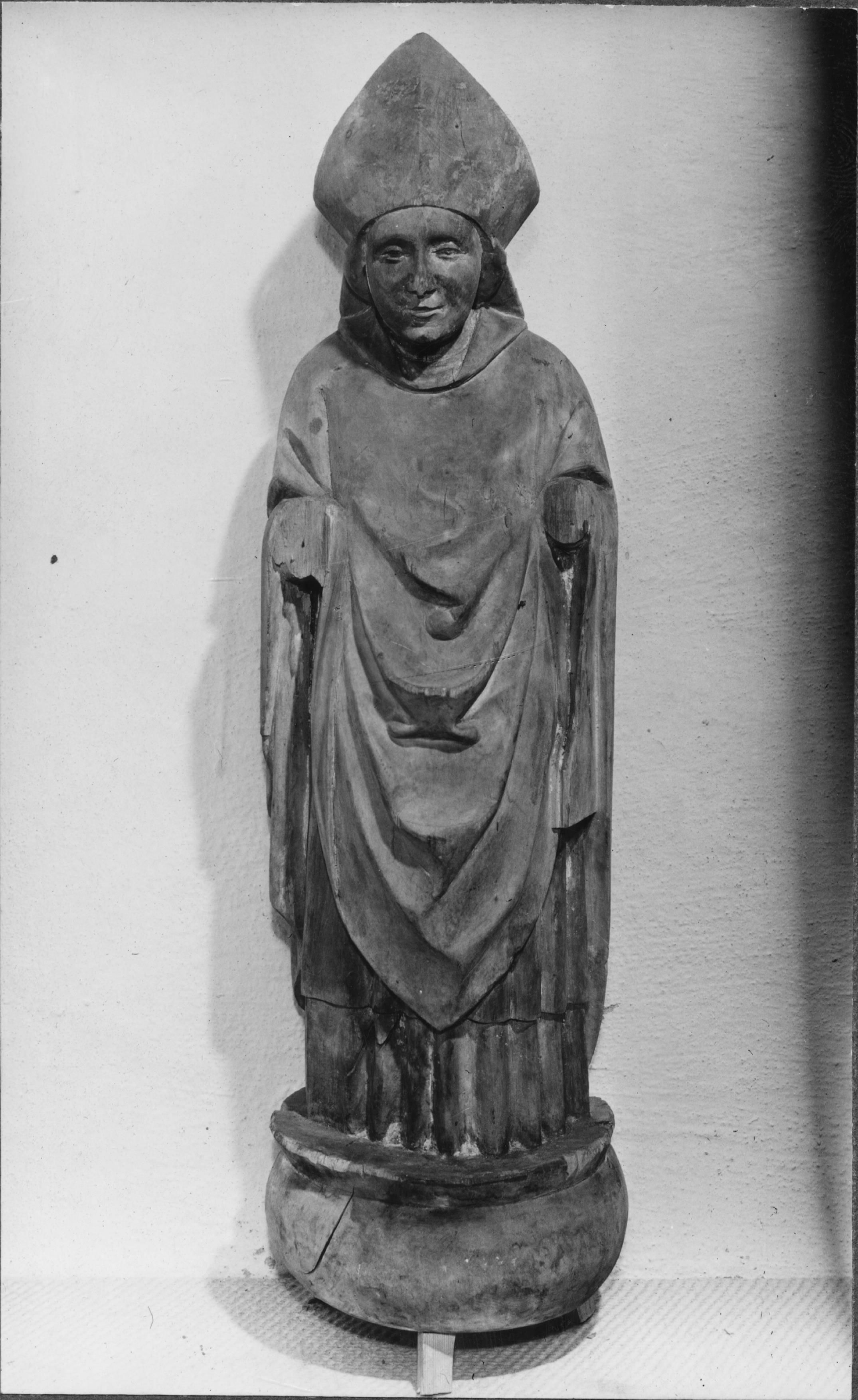 En skulptur. S:t Erasmus, som pinades till döds genom att kokas i en gryta. Medeltida helgonbild.